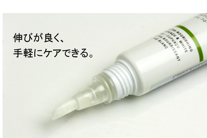 チューブ本体を軽く押し、乾燥した甘皮周りに塗布し、マッサージするようになじませます。